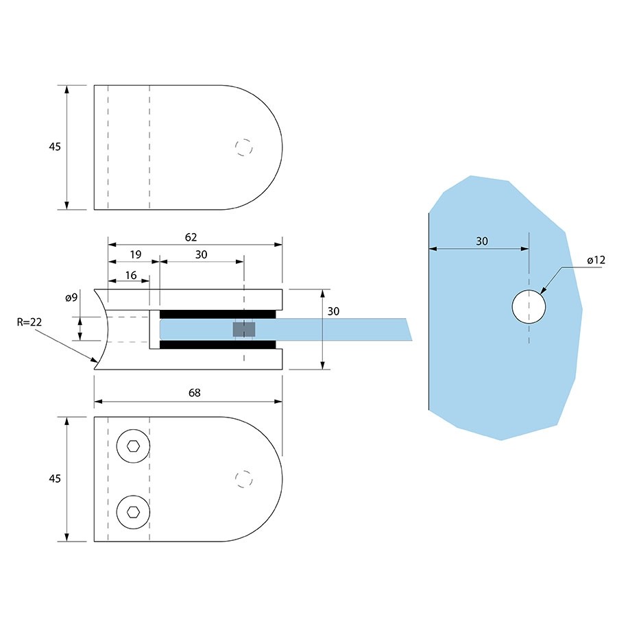 Geschikt voor verschillende glasdiktes. RVS 316 voor buiten toepassing. Zekeringsstift inbegrepen.